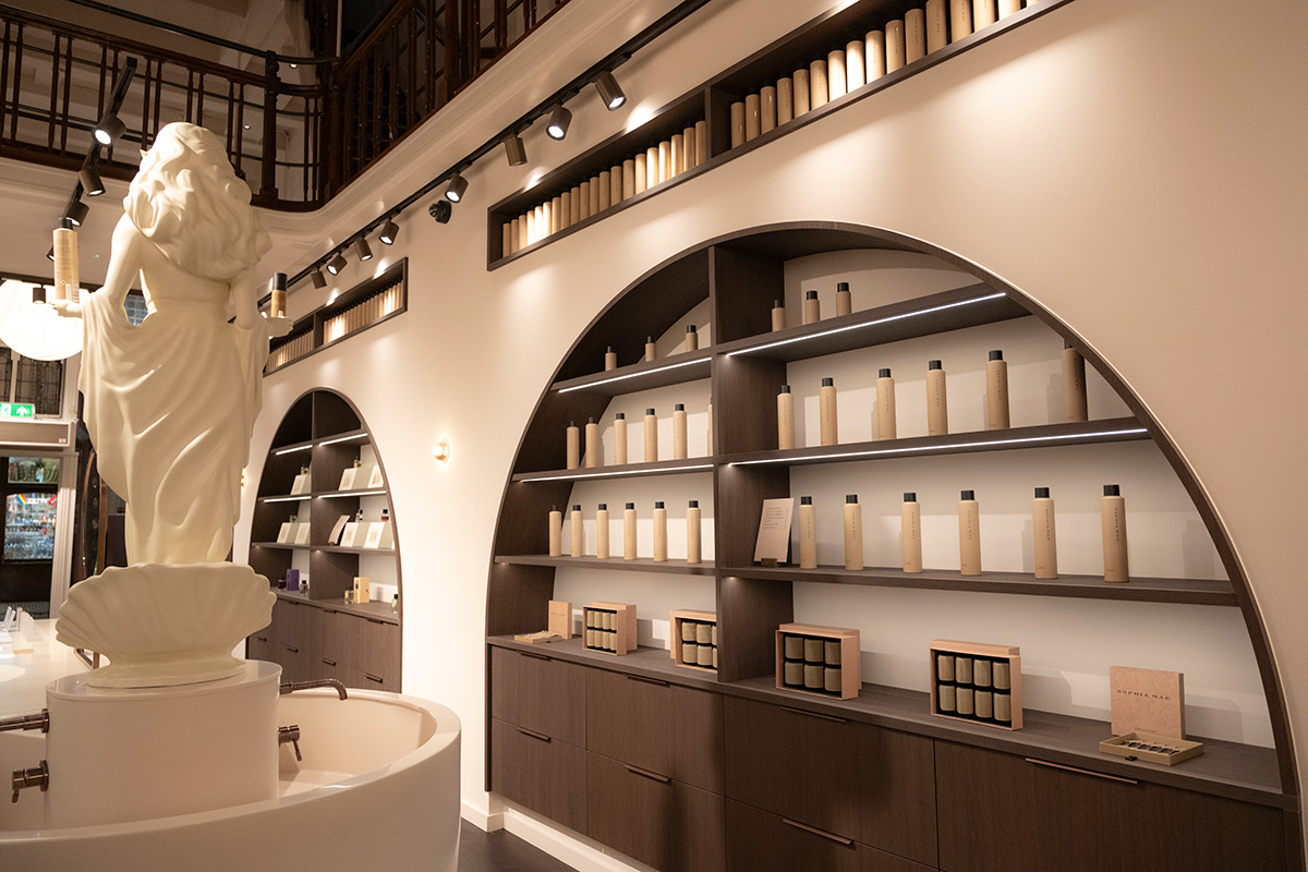 Voor de eerste flagship store van Monica Geuze, founder van de lifestyle brand Sophia Mae, in Amsterdam was de uitdaging om binnen een korte tijd de kenmerkende merkidentiteit te vertalen naar een fysieke winkelervaring. Geopend in een prachtig monumentaal pand vroeg dit project om maatwerkoplossingen, flexibiliteit in uitvoering en een hoge mate van precisie.