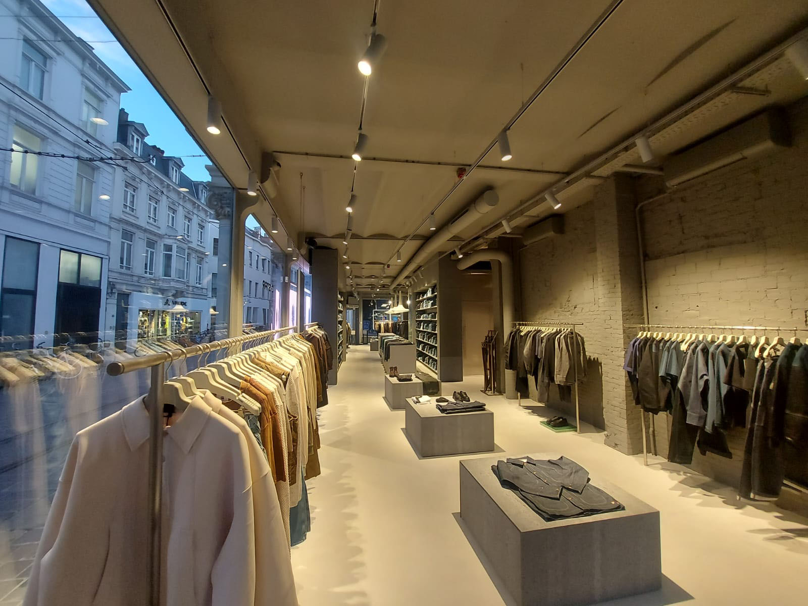 De eerste winkel met dit nieuwe concept bevindt zich in een historisch hoekpand in Gent. Het gebouw, met zijn hoge bogen, grote etalages en originele architectonische details, vormde een krachtig uitgangspunt voor het ontwerp. De historische gevel contrasteert bewust met het industriële en minimalistische interieur, waardoor een unieke mix ontstaat van erfgoed en modern Retail design.